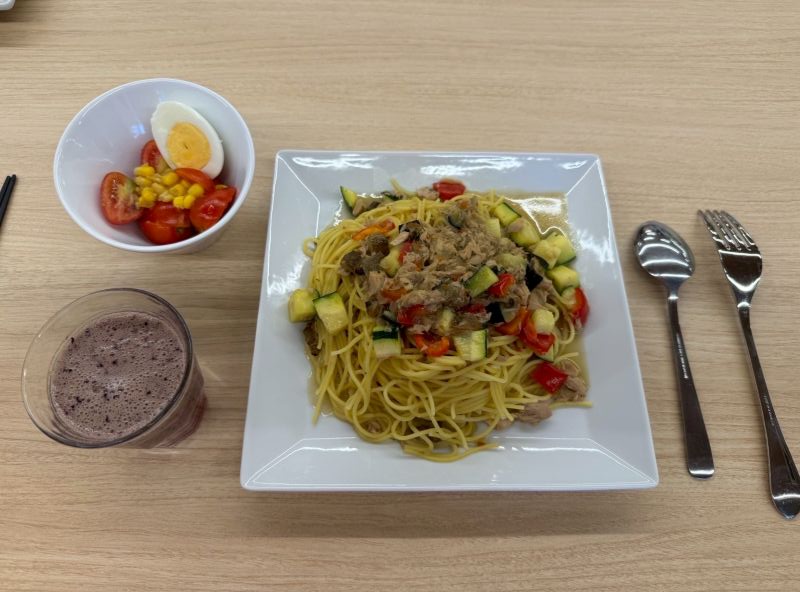 メイン・夏野菜とアサリのパスタ、サラダ・トマトとコーンのサラダ、ドリンク・ブルーベリースムージー