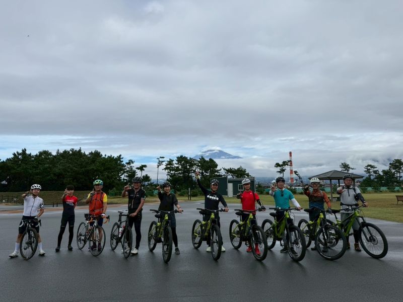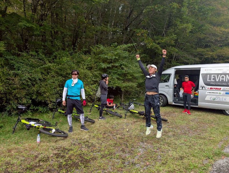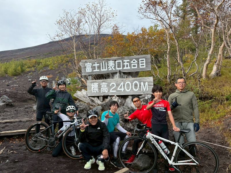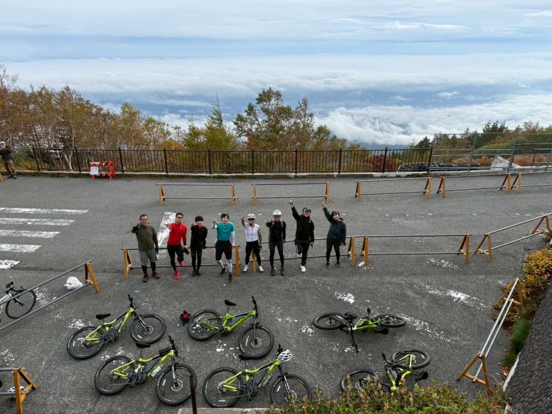獲得標高2500m、往復走行距離100kmのハードコースにE-BIKE6名、ロードバイク3名で挑戦。参加者の中にはスポーツに馴染みの無い方も多く、期待半分、不安半分の走り出しでしたがE-BIKEのアシストは絶大!全員5合目まで到達しました!