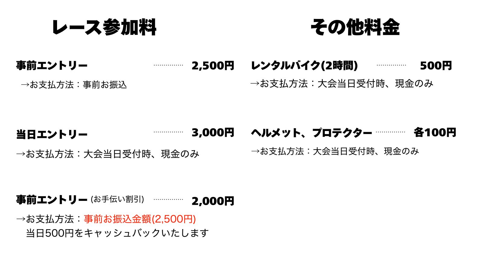 ☞レース参加(当日エントリー) 3,000円(税込)~各レースの1時間30分前まで~