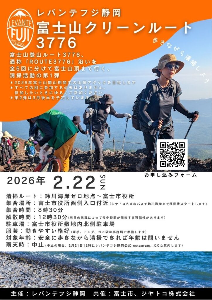 この度、2026年2月22日(日)より、富士山を海抜0mから山頂の3776mまで登頂するルート3776、通称【ROUTE 3776】沿いを全5回に分けて富士山頂まで行く清掃活動、富士山クリーンルート3776活動を始動します!
