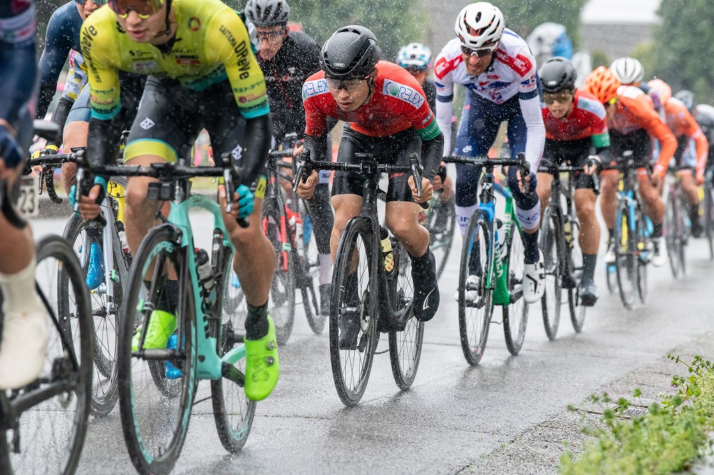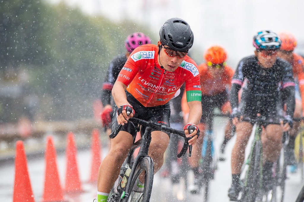 レースは13:10に53人でスタート。降り続く雨の中1周半のパレード区間を終えてアクチュアルスタート。3周目で複数台が絡む落車が発生。レバンテフジ静岡の選手は巻き込まれずに済んだが、このあたりから早いペースでレースが進み激しいポジション争いが繰り返される。逃げの姿勢を見せる選手がいても他選手の反応が無く、逃げ集団は形成されない。