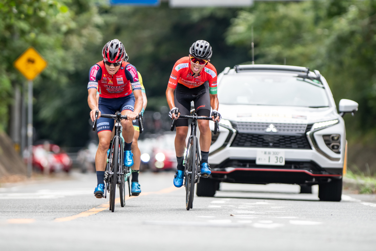 2回目のカルストベルク、後半の展開に備えていた海野が機材トラブルに見舞われ、チームカーのサポートでスペアバイクへの交換を余儀なくされてしまった。一時は集団から遅れるも、高梨の全力アシストで集団復帰を果たす。