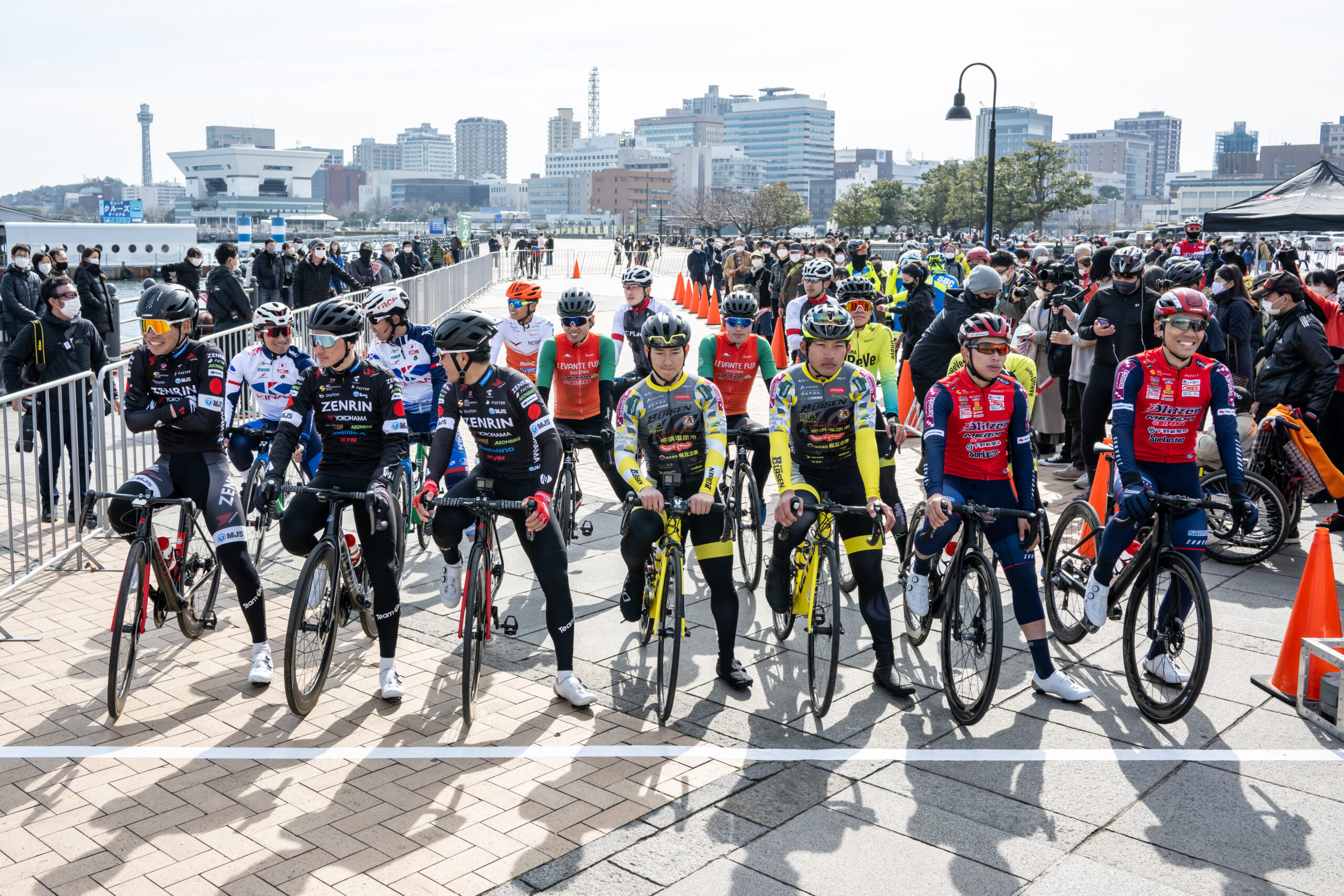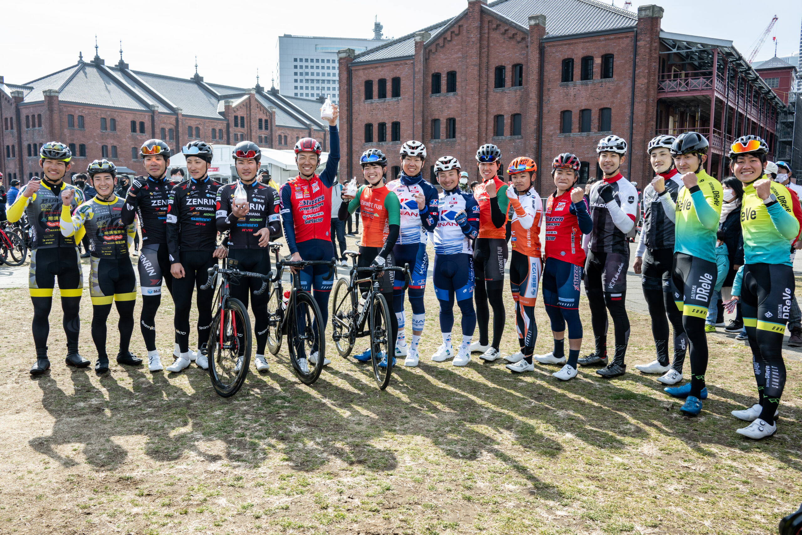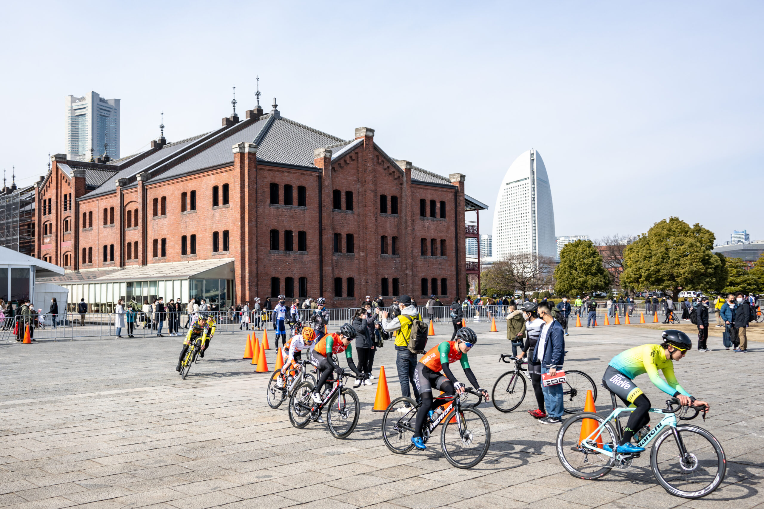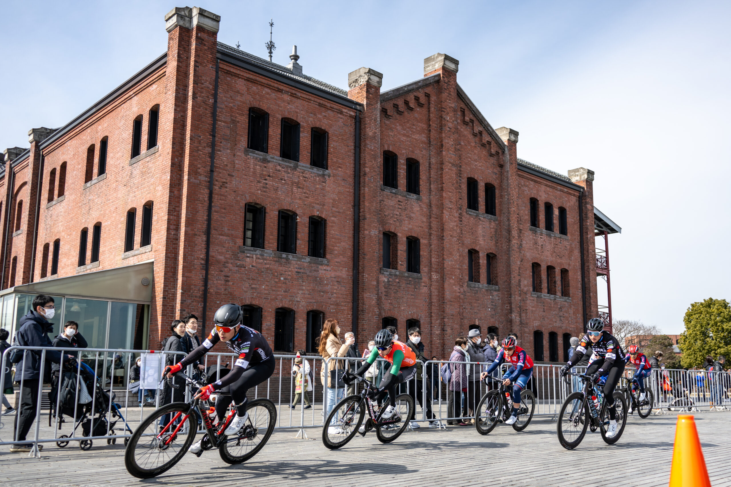 コロナ禍とはいえ、たくさんの人で賑わう週末の横浜赤レンガ倉庫で初開催された自転車レース。400m×30周の12kmの超ショートコースを総勢16名のプロ選手が駆け抜けました。