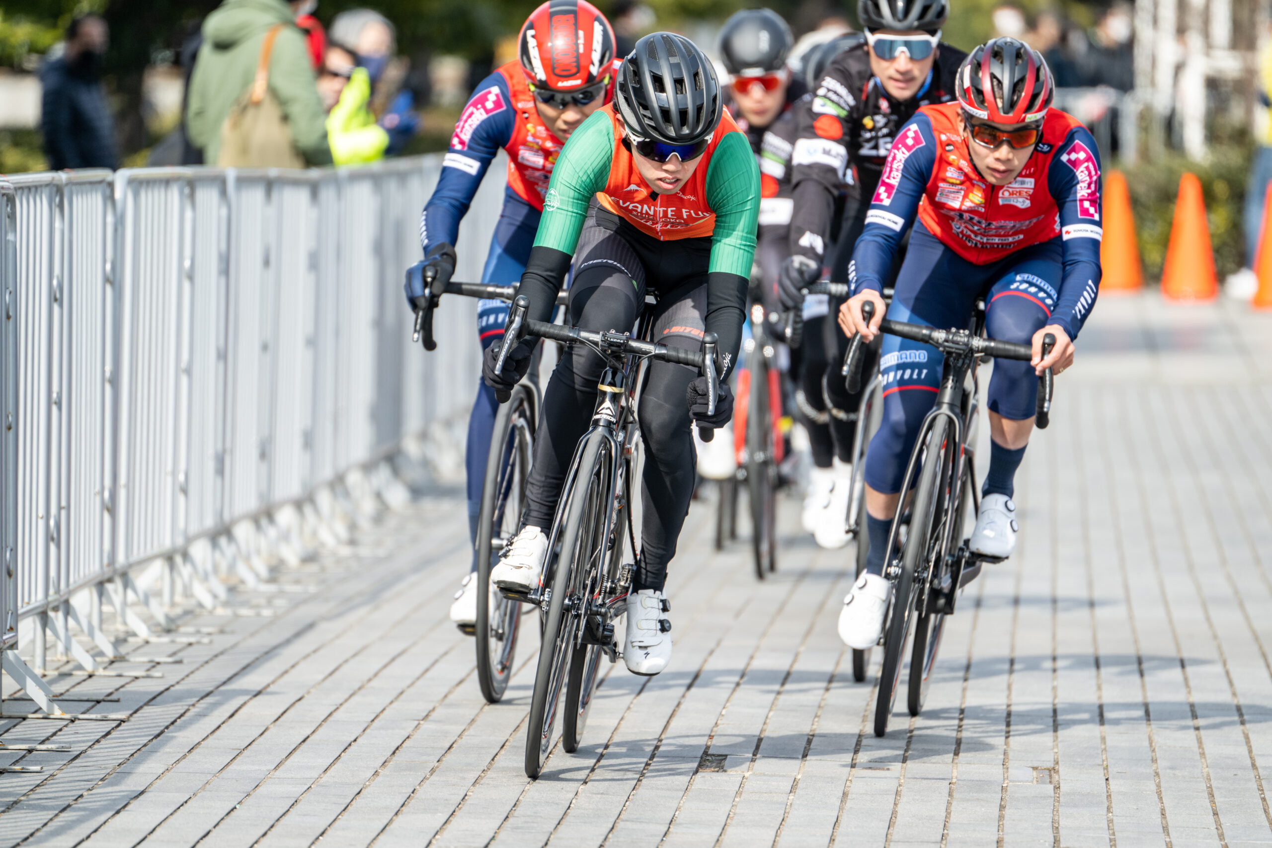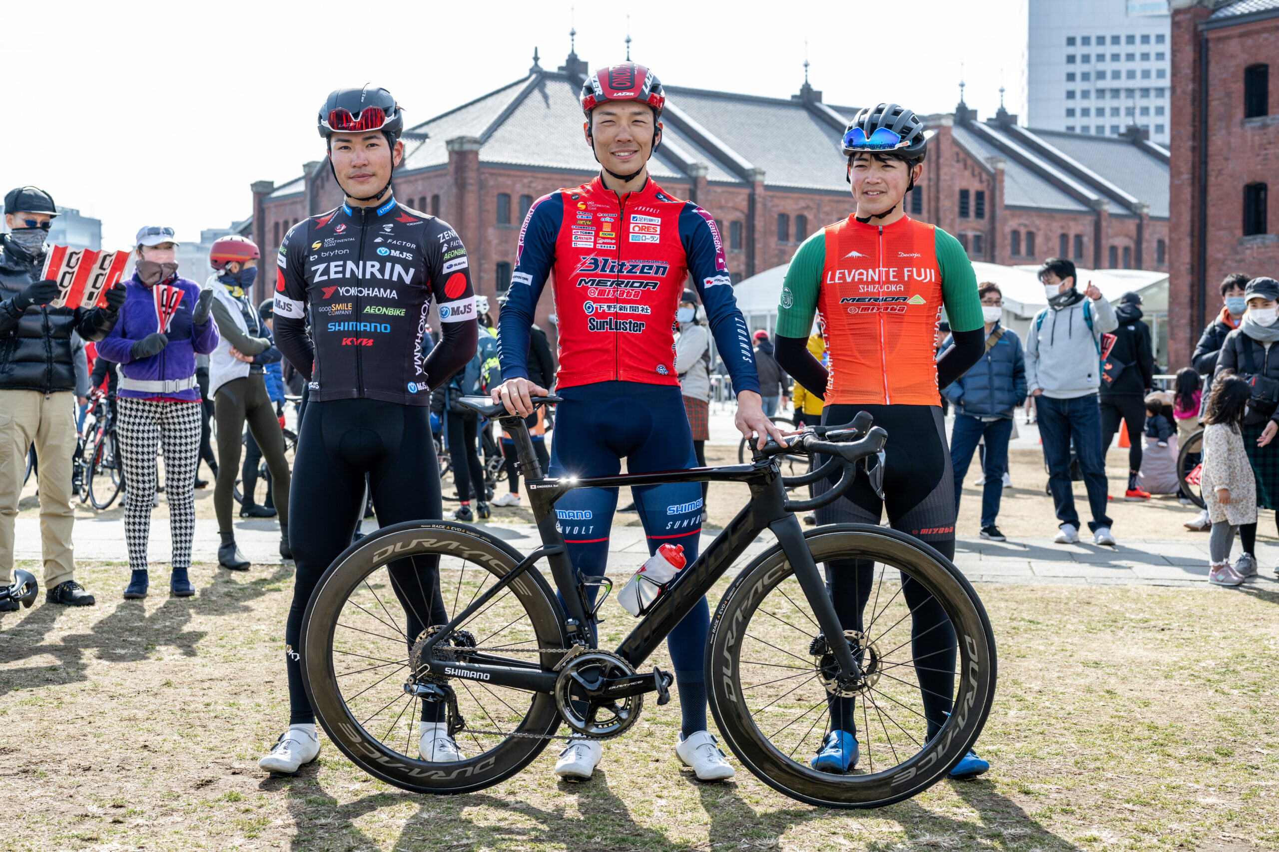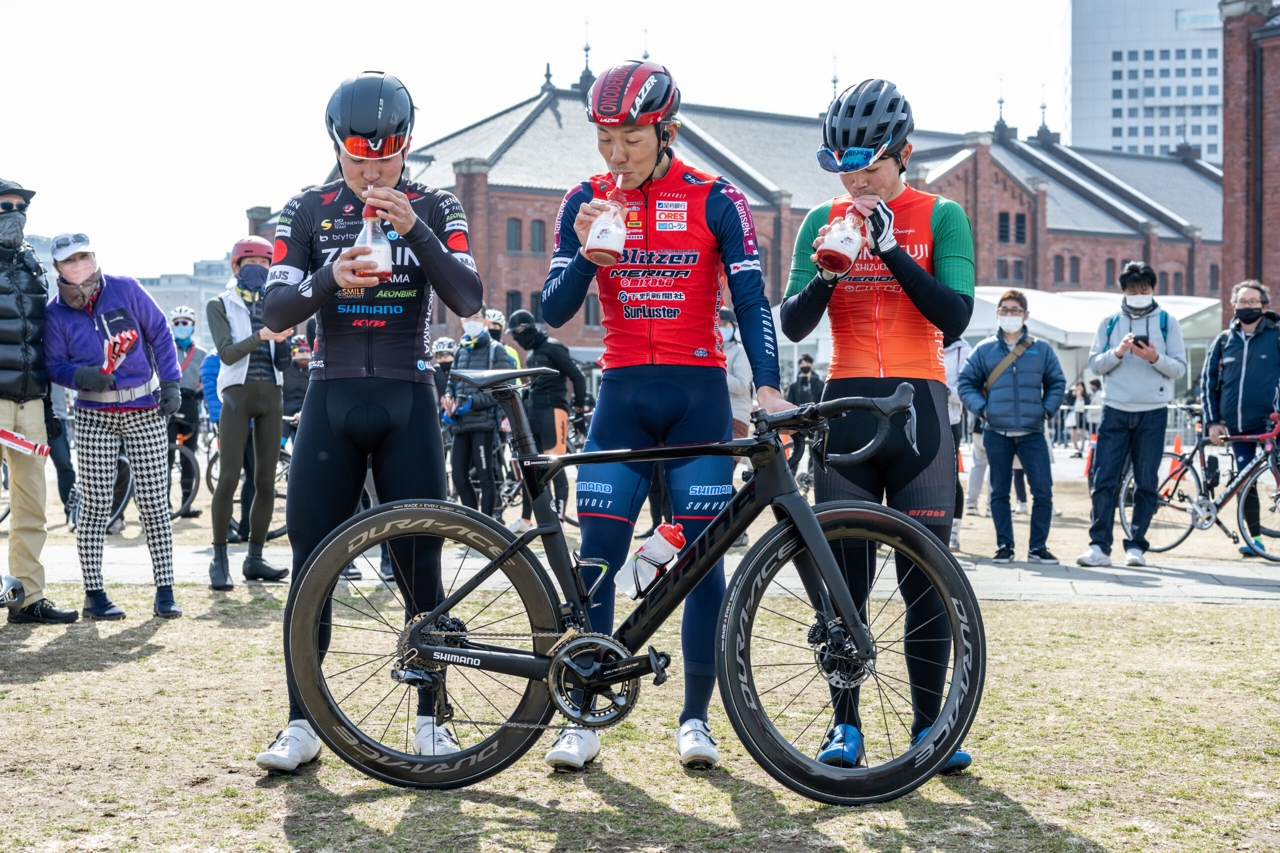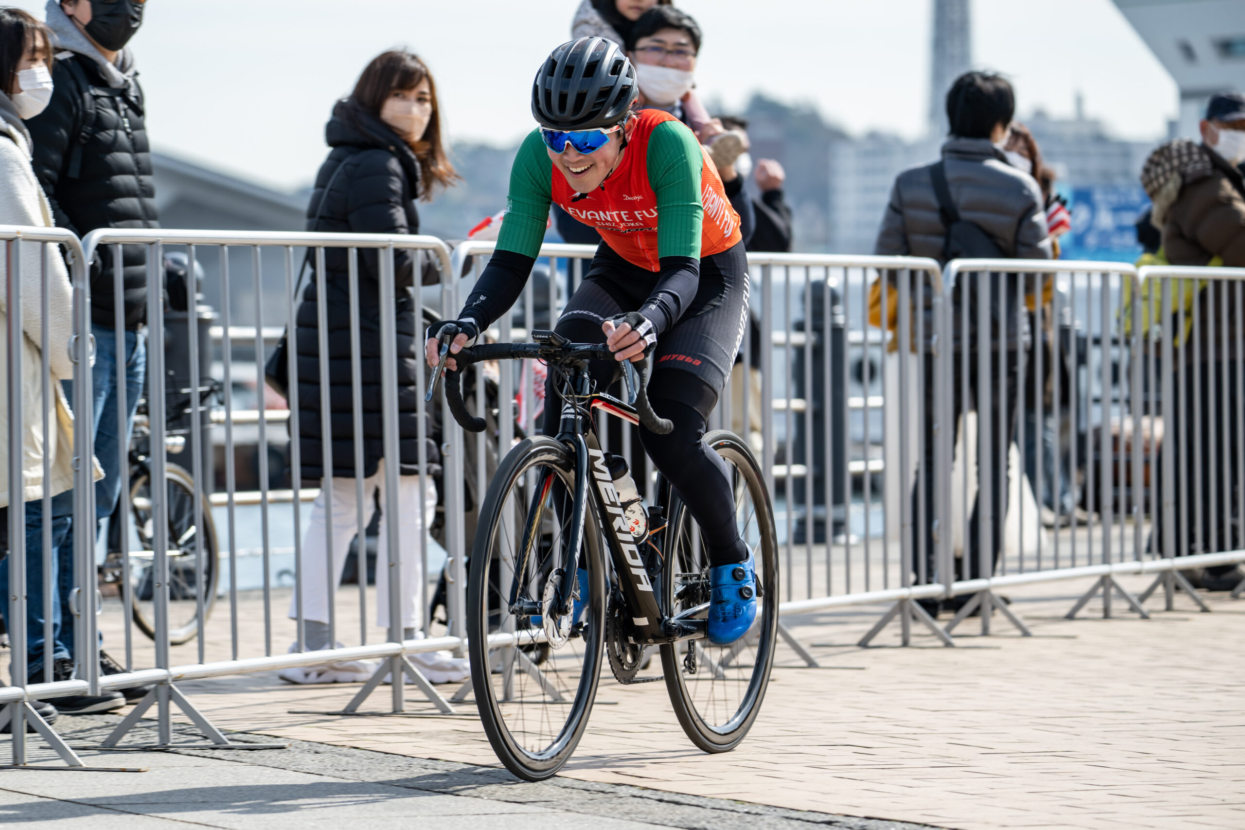 コロナ禍とはいえ、たくさんの人で賑わう週末の横浜赤レンガ倉庫で初開催された自転車レース。400m×30周の12kmの超ショートコースを総勢16名のプロ選手が駆け抜けました。